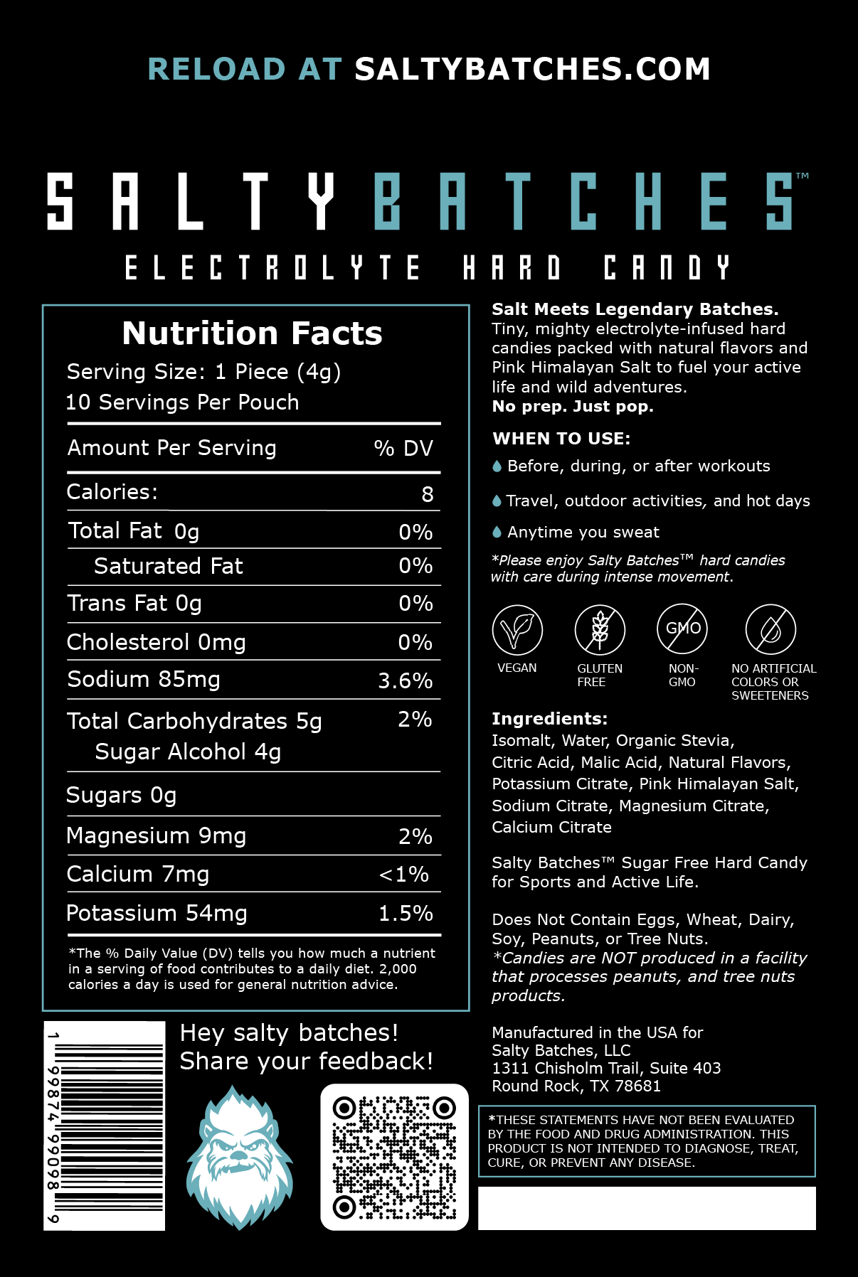 Each citrus-packed hard candy contains 85 mg of sodium, including mineral-enriched Pink Himalayan salt, delivering a bold, refreshing way to enjoy electrolytes wherever your day takes you, from workouts to work calls.